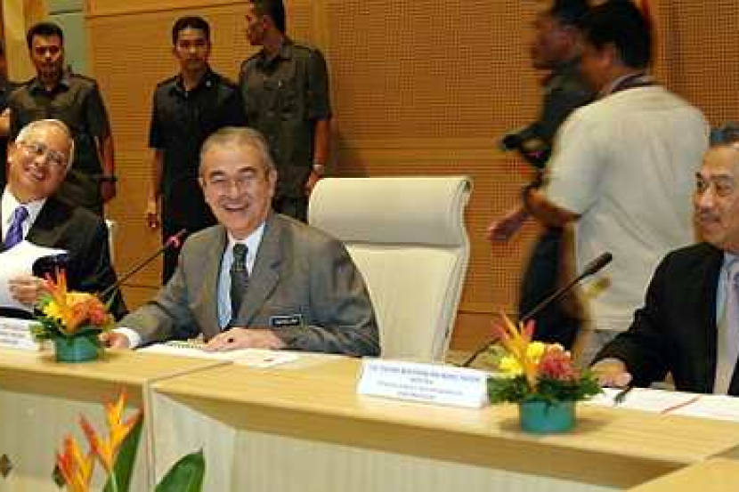ABDULLAH Ahmad Badawi (tengah) mengumumkan Timbalannya, Datuk Seri Mohd. Najib Tun Razak sebagai Menteri Kewangan yang baru (kiri) sambil diperhatikan oleh Menteri Perdagangan Antarabangsa dan Industri, Tan Sri Muhyiddin Yassin semasa mula mempengerusikan mesyuarat kedua Majlis Ekonomi 2008 di Putrajaya pagi ini. - foto The Star oleh ROHAIZAT MD. DERUS