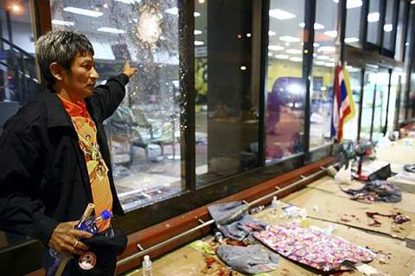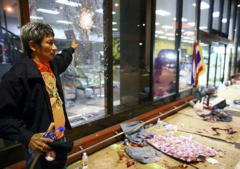 Seorang penyokong anti-kerajaan menunjukkan kesan letupan bom yang berlaku semasa protes di Lapangan Terbang Domestik di Don Muang, Bangkok semalam. Sekurang-kurangnya seorang terkorban manakala dua puluh dua orang penyokong anti-kerajaan cedera dalam kejadian terbabit. (Foto AP)