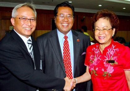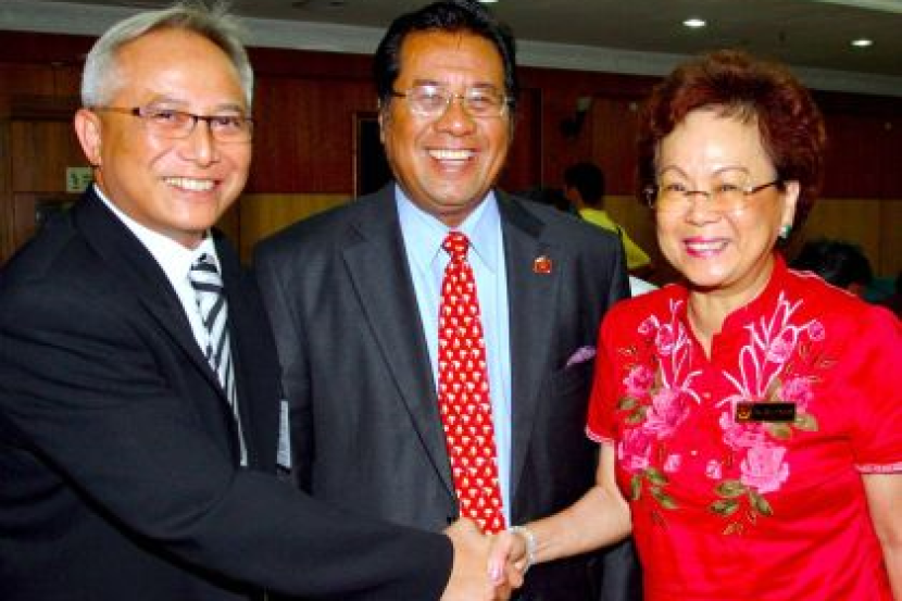 Khalid (tengah) menyaksikan Othman bersalaman dengan Low pada sidang media mengumumkan pelantikan Othman sebagai Pengurus Besar PKNS yang baru di pejabatnya di Shah Alam, hari ini.