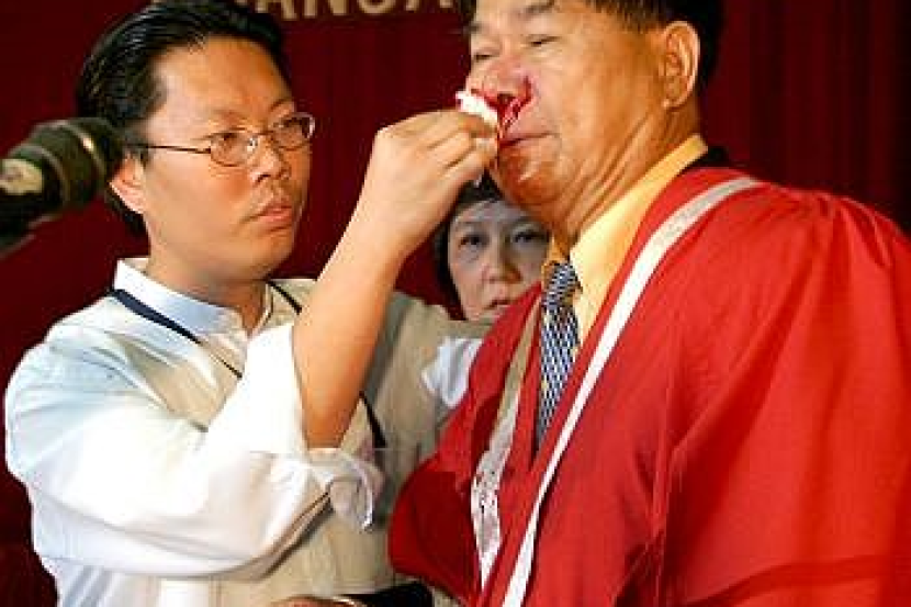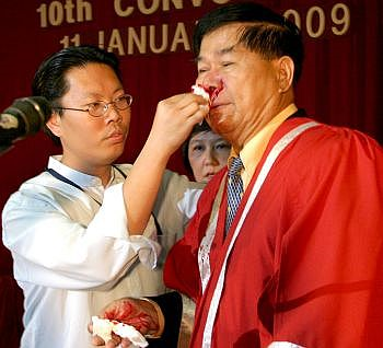 SEORANG petugas mengelap darah di hidung Pengerusi Senat Kolej New Era, Dr Yap Sin Tian (kanan) selepas cedera akibat diserang seorang lelaki ketika sedang memberi ucapan di majlis konvokesyen kolej tersebut, semalam --fotoSINCHEWDAILY