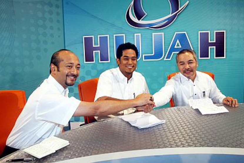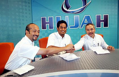 CALON Ketua Pemuda Umno, (dari kiri) Datuk Mukhriz Mahathir, Khairy Jamaluddin dan Datuk Seri Khir Toyo sebelum ditemubual dalam rancangan Hujah yang disiarkan secara langsung dari Dewan Bahasa dan Pustaka, Kuala Lumpur, malam tadi.