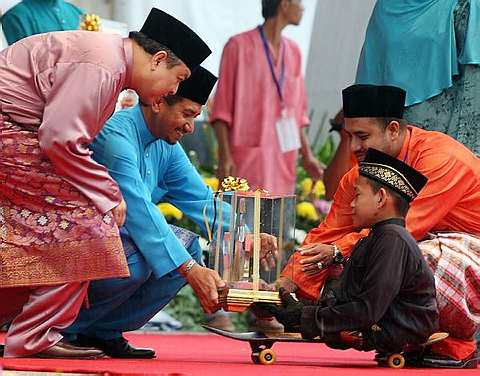 ANUGERAH... Yang di-Pertuan Agong Tuanku Mizan Zainal Abidin berkenan menyampaikan Anugerah Maulidur Rasul Peringkat Kebangsaan kepada Muhammad Haziq Samrat sempena Sambutan Maulidur Rasul Peringkat Kebangsaan 2009 di Dataran Merdeka hari ini. Turut hadir Menteri di Jabatan Perdana Menteri Datuk Seri Dr Ahmad Zahid Hamidi (kiri). Muhammad Haziq,14, merupakan kanak-kanak istimewa yang kurang upaya dari dari bahagian pinggang hingga ke bawah. Sambutan kali yang bertemakan "Wahdah Pemangkin Khaira Ummah" dimulakan dengan perarakan sambil berselawat ke atas junjungan besar Nabi Muhammad s.a.w, turut disertai kontinjen daripada jabatan kerajaan, swasta, pertubuhan bukan kerajaan, sekolah, institusi pengajian tinggi awam dan istitut latihan dan wakil masjid membabitkan kira-kira 100,000 peserta. -- fotoBERNAMA [DIKEMAS KINI] KUALA LUMPUR Yang di-Pertuan Agong Tuanku Mizan Zainal Abidin hari ini menyeru rakyat supaya menghayati sejarah kehidupan junjungan besar Nabi Muhammad s.a.w yang meletakkan kepentingan kesatuan dan perpaduan di kalangan manusia sebagai asas kecemerlangan dan pemangkin khaira ummah (umat yang berkualiti dan baik).Baginda bertitah, usaha untuk menyatupadukan masyarakat adalah usaha yang berterusan sejajar dan bertepatan dengan tuntuan serta cabaran pada alaf ke-21 ini. "Oleh yang demikian, segala dasar dan polisi yang dirangka ke arah menjadikan negara ini dan seluruh rakyat sebagai komuniti negara maju pada masa hadapan tidak akan tercapai jika aspek kesatuan atau perpaduan ini diambil ringan semua pihak."Apabila sebahagian umat manusia dijangkiti sikap tamak dan mementingkan diri serta tidak lagi mempedulikan nilai-nilai mulia dalam mengejar kepentingan duniawi, maka berlakulah pelbagai bentuk malapetaka dan kemusnahan yang menimpa hidup manusia lantaran kemurkaan Allah S.W.T," titah baginda.GALERI GAMBAR SAMBUTAN MAULIDUR RASUL Tuanku Mizan bertitah demikian pada Majlis Sambutan Maulidur Rasul Peringkat Kebangsaan di Dataran Merdeka di sini hari ini.Turut hadir ialah Perdana Menteri, Datuk Seri Abdullah Ahmad Badawi dan Timbalan Perdana Menteri, Datuk Seri Najib Tun Razak.Dalam sambutan bertemakan 'Wahdah Pemangkin Khaira Ummah', baginda bertitah, penghayatan Islam yang telah diterjemahkan melalui sejarah kegemilangannya membuktikan bahawa umat manusia pernah bersatu di atas paksi kebenaran pada suatu ketika dahulu.Pada masa itu wujud suasana keharmonian, kestabilan dan kesefahaman, titah baginda.Tuanku Mizan bertitah Islam juga mengharamkan sebarang bentuk penyelewengan, penyalahgunaan kuasa dan diskriminasi sebaliknya menganjurkan keamanan, hak kesamarataan dan saling membantu.Baginda bertitah, Islam juga mewajibkan perlindungan dan hak sama rata ke atas setiap lapisan masyarakat Islam dan bukan Islam.Tuanku Mizan juga menyeru umat Islam di negara ini supaya sama-sama berusaha dan melaksanakan tanggungjawab dengan penuh keikhlasan dengan meningkatkan penghayatan terhadap kitab suci al-Quran dan sunnah Rasulullah sehingga menjadi umat yang bersatu padu, terbilang dan mapan mendepani cabaran semasa.Pada majlis itu, baginda juga berkenan menyampaikan Anugerah Maulidur Rasul kepada enam penerima.Penerima Anugerah Perdana Maulidur Rasul 2009 yang buat julung kalinya diperkenalkan pada sambutan kali ini ialah Profesor Pendidikan di Institut Pendidikan Universiti Islam Antarabangsa (UIA), Prof Dr. Sidek Baba yang membawa pulang RM50,000 dan plak.Penerima Anugerah Maulidur Rasul pula ialah Setiausaha Agung Persatuan Pengguna Islam Malaysia (PPIM), Datuk Dr. Maamor Osman; Pengarah Urusan Syarikat Laksamana Nusantara Sdn Bhd, Mortadha Abdullah; Yang Dipertua Persatuan Pengasih Malaysia, Mohd. Yunus Pathi Mohd, pelajar Muhammad Ahmad Zahid dan kanak-kanak istimewa yang kurang upaya dari bahagian pinggang ke bawah, Muhammad Haziq Samrat.Kelima-lima mereka menerima wang tunai yang kesemuanya berjumlah RM22,000 dan plak.Sambutan hari ini bermula dengan perarakan sambil berselawat ke atas junjungan besar Nabi Muhammad s.a.w yang terdiri daripada kontinjen jabatan kerajaan, swasta, pertubuhan bukan kerajaan, sekolah, institusi pengajian tinggi awam dan institut latihan dan wakil masjid membabitkan kira-kira 100,000 peserta.Sambutan kali ini turut dihiasi dengan persembahan nasyid dan lagu-lagu ketuhanan, penceritaan kisah-kisah nabi, sketsa dan pukulan kompang oleh artis-artis tempatan seperti Hijjaz, Waheeda, Yassin, kumpulan Kopratasa dan kumpulan Al-Gebra. SAMBUTAN LUAR IBU NEGARADi SEREMBAN, Yang Dipertuan Besar Negeri Sembilan Tuanku Muhriz Ibni Almarhum Tuanku Munawir mengetuai lebih 9,000 peserta perarakan Maulidul Rasul peringkat negeri di padang Majlis Perbandaran Seremban di sini pagi ini.Turut hadir ialah Tengku Aishah Rohani Almarhum Tengku Besar Mahmud, Undang Yang Empat dan Tunku Besar Tampin, Menteri Besar Datuk Seri Mohamad Hasan, Speaker Dewan Undangan Negeri Datuk Razak Mansor dan anggota Exco.Sebanyak 62 kontinjen daripada jabatan dan agensi kerajaan, badan bukan kerajaan (NGO) dan swasta serta orang ramai menyertai perarakan mengelilingi bandar ini sambil membawa sepanduk dan berselawat.Terdahulu, Tuanku Muhriz dalam titahnya menyeru umat Islam di negeri ini supaya berazam menjadi anggota masyarakat yang berimam, berilmu dan berkemahiran serta taat menyempurnakan ajaran Islam dan juga sunnah Rasulullah."Sesungguhnya kita hendaklah menjadikan Nabi Muhammad sebagai contoh dan teladan untuk keharmonian, kesempurnaan dan memperolehi kejayaan di dunia dan di akhirat," titah baginda.Menteri Besar pula mengingatkan umat Islam supaya memainkan peranan yang membina dan mengekalkan keimanan serta nilai kerohanian dan persaudaraan sejati agar dapat menyumbang secara positif kepada pembangunan ummah."Janganlah sekali-kali bersedih atau berputus asa jika usaha dan perjuangan untuk memajukan diri sendiri tidak dihargai, tetapi bersedihlah apabila bangsa dan diri kita tidak lagi mempunyai maruah dan harga diri," katanya dan menurutnya dengan itu umat Islam perlu menguasai pelbaga