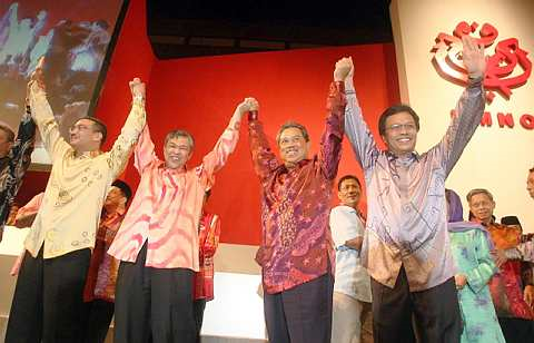 TIMBALAN DAN 3 NAIB PRESIDEN UMNO YANG BARU...Dari kiri, Datuk Seri Hishammuddin Tun Hussien, Datuk Seri Dr Ahmad Zahid Hamidi, Tan Sri Muhyiddin Yassin dan Datuk Seri Mohd Shafie Apdal. Foto THE STAR Oleh KAMARUL ARIFFIN