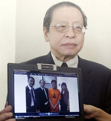 PENASIHAT DAP, Lim Kit Siang menunjukkan gambar beliau bersama aktivis Bersih yang ditahan reman, Wong Chin Huat ketika melawat Wong di Mahkamah Kuala Lumpur di sini, tengah hari tadi --foto THE STAR oleh Abdul Rahman Senin