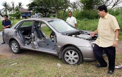 HILANG... Ahli Dewan Undangan Negeri Bakar Bata, Datuk Paduka Ahmad Bashah Md. Hanipah (kanan) memeriksa kereta Proton Waja miliknya yang 'dibogelkan' selepas dicuri empat hari yang lalu. - foto The Star oleh G.C. TAN