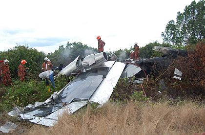 PASUKAN bomba memeriksa pesawat ringan yang terhempas di Taiping, Perak hari ini yang mengorbankan juruterbang pesawat warga United Kingdom, Michael Robert Dacre, 53.--fotoSIN CHEW DAILY