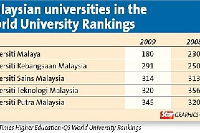 PETALING JAYA: Universiti Malaya (UM) meletakkan Malaysia semula dalam senarai 200 universiti terbaik oleh Times Higher Education (THE)-QS World University Rankings 2009 selepas melonjak sebanyak 50 tangga tahun lalu ke tangga 180 tahun ini.Pengarah Urusan QS, Nunzio Quacquarelli berkata, ranking itu bukan sahaja mengenalpastikan ranking tertinggi universiti di dunia, bahkan universiti yang cemerlang dalam subjek-subjek utama tertentu, menjadi sasaran para majikan, menghasilkan penyelidikan terbaik, melabur dalam pengajaran serta mempunyai profil antarabangsa. Universiti tempatan lain yang turut meningkat rankingnya ialah Universiti Teknologi Malaysia (UTM), menduduki tangga 320 berbanding 356 tahun lalu.Universiti Kebangsaan Malaysia (UKM), Universiti Sains Malaysia (USM) dan Universiti Putra Malaysia (UPM) jatuh antara satu hingga 41 tangga kepada kedudukan ke-291, 314 dan 345 masing-masing.Ketua QS Quacquarelli Symonds Ltd Intelligence Unit Ben Sowter berkata, kebangkitan semula UM dalam ranking 200 terbaik dunia adalah amat mengagumkan."Usaha kolektif universiti untuk menarik sejumlah besar para pelajar antarabangsa menunjukkan satu harapan yang progresif," katanya dalam satu temuramah emel.Menteri Pengajian Tinggi, Datuk Seri Mohamed Khaled Nordin memberitahu The Star bahawa kementerian menyedari universiti-universiti tersebut lemah dalam citation per faculty dan peer review.Universiti Harvard sekali lagi mengungguli ranking THE-QS diikuti Cambridge, Yale, University College London, Imperial College, Universiti Oxford, Universiti Chicago, Universiti Princeton, Massachusetts Institute of Technology dan California Institute of Technology.Institusi pengajian tinggi Asia yang mempunyai ranking tertinggi dalam senarai THE-QS adalah Universiti Tokyo (22), Universiti Hong Kong (24), Universiti Kyoto (25) dan National University of Singapore (30).Naib Canselor UM Prof Datuk Dr Ghauth Jasmon berkata kejayaan tersebut meningkatkan semangat dan motivasi semua staf dan pelajar agar lebih berusaha mencapai kejayaan yang lebih cemerlang."Pendefinisian semula Petunjuk Prestasi Utama (KPI) untuk para akademik, inisiatif-inisiatif baru dilaksanakan dalam rangkaian antarabangsa, pengambilan staf dan para pelajar telah menghasilkan impak yang cepat dan positif," katanya.Naib Canselor UTM Prof Datuk Dr Zaini Ujang berkata peningkatan dalam ranking universiti adalah ekoran strategi dalam perangkaian, kualiti, penyelidikan strategik, sinergi dan budaya organisasi.Mengenai kejatuhan ranking UKM dari tangga 250 ke 291, Timbalan Canselor (Akademik dan Hal Ehwal Antarabangsa) Prof Dr Hassan Basri berkata pihak universiti tidak terkejut dengan penurunan ranking itu.Ini kerana katanya, THE-QS telah menunjukkan bahawa penyelarasan secara metodologi dan tinjauan dinamik akan mengurangkan markah secara signifikan untuk academic peer review and kriteria tinjauan majikan untuk tempoh tiga tahun bermula tahun 2008.Naib Canselor UPM Prof Datuk Dr Nik Mustapha R. Abdullah berkata dia hairan mengenai penurunan ranking universiti walaupun pencapaian universiti tahun lalu adalah lebih baik berbanding tahun sebelumnya.
