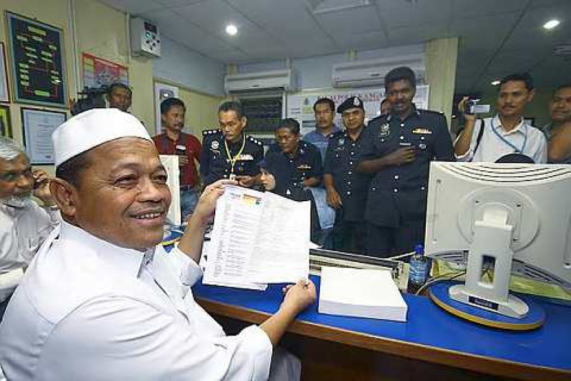 Anggota Dewan Undangan Negeri (ADUN) Tambun Tulang, Datuk Seri Shahidan Kassim (kiri) menunjukkan salinan laporan polis yang dibuatnya di Balai Polis Kangar dekat sini, hari ini. Shahidan membuat laporan polis berhubung memorandum Persatuan Peguam Syarie Malaysia (PGSM) dan kenyataan Penolong Pengarah Instituti Latihan Islam Malaysia (ILIM), Zamihan Mat Zain Al Ghani mengenai kenyataannya dalam sebuah akhbar terhadap bekas mufti Perlis, Dr Asri Zainul Abidin.-- fotoBERNAMA