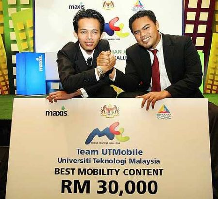 Pelajar Universiti Teknologi Malaysia Hasnol Ariff Hussin (kiri) dan Muhamad Bukhairi Samsudin bersama replika cek selepas memenangi perisian mobiliti terbaik sempena Maxis Mobile Content Challenge 2009 di Kuala Lumpur hari ini. - Foto The Star SHAARI CHEMAT KUALA LUMPUR: Kerajaan mahu syarikat-syarikat telekomunikasi memberi tumpuan kepada perisian yang menekankan aspek budaya dan pembangunan tamadun bangsa dalam usaha menyemarakkan semangat 1Malaysia.Menurut Menteri Penerangan Komunikasi dan Kebudayaan, Datuk Seri Dr Rais Yatim aspek-aspek itu perlu diberi perhatian kerana era komunikasi telah berkembang dengan begitu canggih, elangkau sempadan dan perbatasan negara serta kaum diseluruh dunia. “Aplikasi-aplikasi terkini seperti SMS, Blackberry, Yahoo Messenger, Twitter, ICQ Skype dan sebagainya telah menjadikan komunikasi antara manusia begitu mudah.“Ini menjana kepada pembangunan manusia serta merubah lanskap komunikasi sejagat yang dahulunya sangat bergantung kepada telefon, teleks, fax dan perkhidmatan pos,” katanya dalam ucapan penutupan dan penyampain hadiah program pertandingan 'Mobile Content Challenge 2009' di sini semalam. Teks ucapan beliau dibacakan oleh timbalannya, Datuk Joseph Salang.Menurut Rais, tindakan segelintir pengguna laman sembang dan aplikasi Internet yang menyebarkan khabar angin dengan pantas boleh mengakibatkan kebencian di kalangan penduduk tempatan.“Pertandingan seperti ini sudah tentu dapat memupuk semangat kerjasama antara peserta dari pelbagai kaum, agama serta pelbagai bidang kemahiran," kata beliau.Tambahnya, dengan kemudahan teknologi komunikasi kini, aspek kebudayaan dan bahasa juga terancam.“Penggunaan ejaan ringkas dalam khidmat pesana ringkas (SMS) contohnya boleh menjejaskan kemurnian Bahasa Melayu itu sendiri,” katanya.Sementara itu, juara keseluruhan pertandingan tersebut adalah pasukan Universiti Teknologi Malaysia (UTM) dengan hasil ciptaan mereka dikenali sebagai 'Flyer: On-The-Fly Flash Composer And Community’.Mereka berjaya memenangi hadiah wang tunai berjumlah RM30,000.Manakala kategori Mobile Entertainment yang bertemakan pembangunan masyarakat 1Malaysia dimenangi oleh kumpulan Genex dari Universiti Putra Malaysia (UPM) dan kumpulan Vicegerent dari Universiti Islam Antarabangsa (UIA) pula memenangi kategori Mobile Info Base Masing-masing memenangi hadiah wang tunai RM10,000.