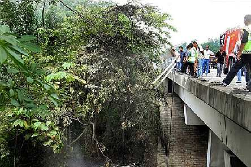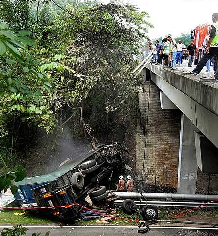 Lori kontena itu melanggar belakang sebuah lori lima tan, lalu terbabas sebelum merempuh besi penghadang jambatan dan terhumban ke bawah jambatan setinggi kira-kira 10 meter, katanya.