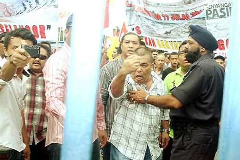 Mereka turut melaungkan slogan berbunyi "Hidup Rakyat, Hancur PKR", "PKR perompak pasir" dalam perhimpunan itu yang dikawal ketat oleh 60 pegawai dan anggota polis. - BERNAMA