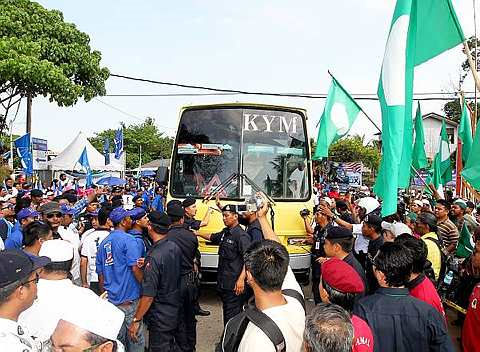 Sebuah bas yang membawa pelajar-pelajar dari Kolej Yayasan Melaka menjadi tumpuan penyokong-penyokong Barisan Nasional (BN) dan PAS yang mendakwa membawa pengundi hantu dari dari luar Melaka. Setelah kedua-dua wakil dari BN dan PAS memeriksa bas tersebut, mereka dibenarkan melalui jalan tersebut kerana bas tersebut mahu menuju ke sebuah kem bina semangat yang terletak di berhampiran pusat pengundian di Sekolah Kebangsaan ChinChin. Kelihatan para penyokong kedua-dua parti politik mengerumuni bas tersebut berdekatan pusat pengundian Sekolah Kebangsaan ChinChin di Jasin, Ahad. - Foto BERNAMA