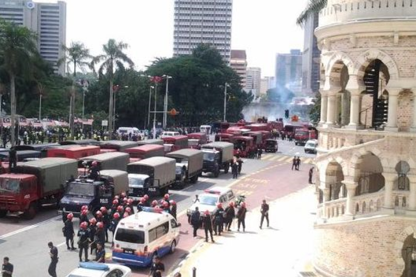 3.00 petang: Polis melepaskan tembakan gas pemedih mata dan meriam air ke arah penyokong selepas mereka merusuh halangan yang dipasang polis di hadapan Dataran Merdeka.