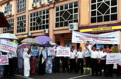 ALOR SETAR: Kira-kira 200 warga kerja Kolej Universiti Insaniah (Kuin), pada Selasa membuat demonstrasi aman mendesak Rektornya Prof Datuk Dr Jamil Osman meletak jawatan.