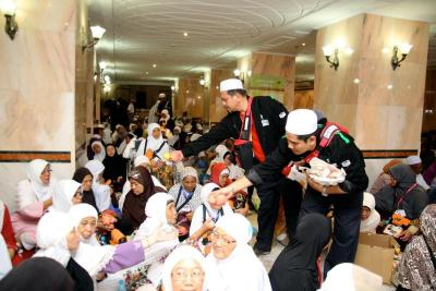 Petugas Tabung Haji, Baharuddin (berdiri dua kanan) dan Zulkifli (berdiri kanan) sedang mengagihkan makanan dan minuman kepada jemaah haji yang ditempatkan dipenempatan sementara, di Hotel Abraj Al-Janadiriyyah setelah bangunan hotel penginapan mereka di Qasr Al-Janadiriyyah dilaporkan mengeluarkan kepulan asap di lobi hotel penginapan tersebut. Walau bagaimanapun tiada kebakaran yang dikesan di bangunan berkenaan, kata Bomba Arab Saudi. -fotoBERNAMA