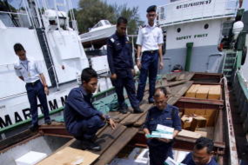 Beberapa anggota Agensi Penguatkuasaan Maritim Malaysia (APMM) memeriksa kotak-kotak berisi rokok kretek yang cuba diseludup semasa kapal yang ditahan itu di bawa ke Pusat Tahanan Vesel, Kemaman, Terengganu. Kira-kira 50,000 karton rokok berkenaan cuba diseludup di sekitar perairan Kuala Pahang, petang Selasa. Sehubungan itu seramai 14 suspek warga Indonesia dan enam suspek warga tempatan yang berada di atas kapal itu telah ditahan untuk membantu siasatan. -fotoBERNAMA
