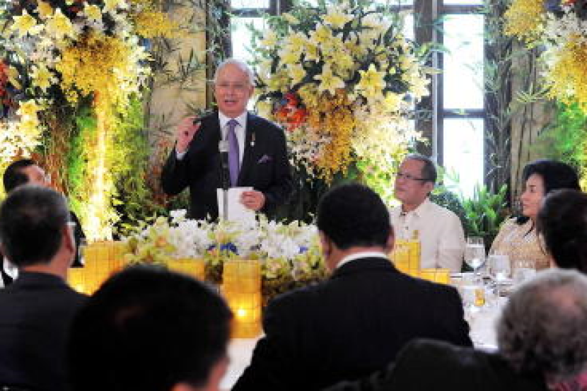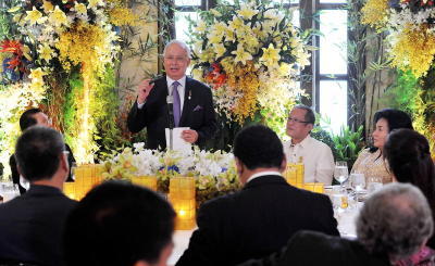 Perdana Menteri Datuk Seri Najib Tun Razak menyampaikan ucapan pada majlis jamuan tengahari sambil diperhatikan oleh Presiden Benigno S. Aquino III di Istana Malacanang di Manila, Isnin. Hadir sama ialah isteri perdana menteri, Datin Seri Rosmah Mansor. -fotoBERNAMA