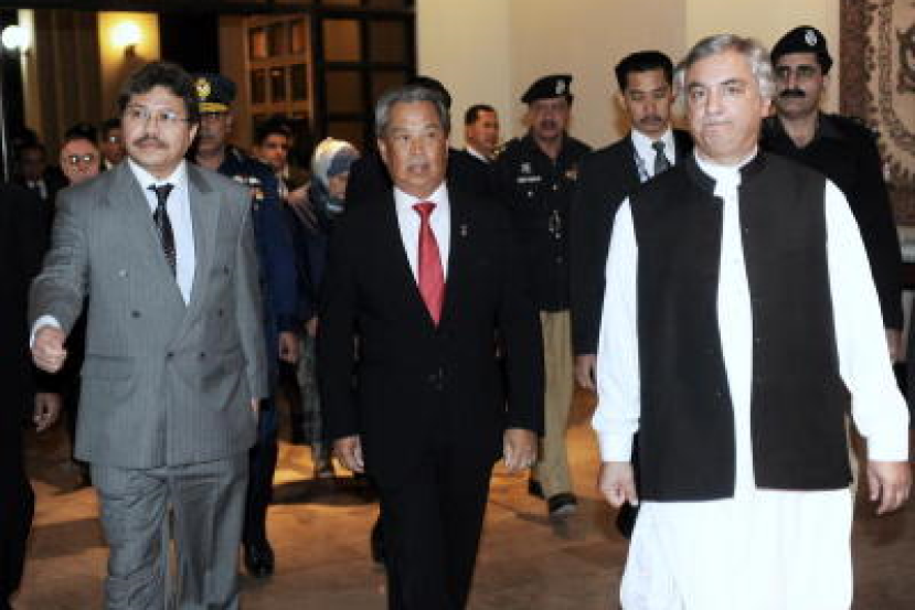 Muhyiddin diiringi Menteri Komunikasi Pakistan, Dr Arbab Alamgir Khan (kanan) setibanya di Pengkalan Tentera Udara Chaklala bagi menghadiri Sidang Kemuncak ke Lapan Kumpulan Lapan Negara Membangun (D8) di Islamabad, Khamis. Turut hadir Persuruhjaya Tinggi Malaysia di Pakistan, Dr Hasrul Sani Mujtabar (kiri) dan beberapa pegawai kedutaan. -fotoBERNAMA