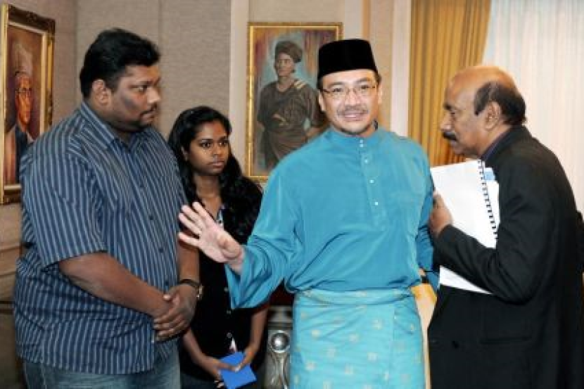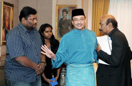 Menteri Dalam Negeri, Datuk Seri Hishamuddin Tun Hussein bersama pasangan adik-beradik, B. Reshina, 18, (dua kiri) dan Dinesh Kumar a/l Batumanathan, 26, serta Pakar Rujuk Pasukan Petugas Khas Pelaksanaan, Jawatankuasa Kabinet Masyarakat India, Datuk Siva Subramaniam (kanan) pada majlis penyerahan MyKad kepada pasangan adik beradik itu di Kementerian Dalam Negeri di sini, Jumaat.
