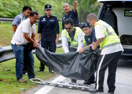 PEROMPAK MAUT...Pihak polis mengangkat mayat salah seorang perompak yang cuba melarikan diri di Seremban pada Sabtu. Dua perompak maut selepas dua motosikal yang ditunggangi mereka terbabas ketika cuba melarikan diri dari sepasukan anggota polis yang mengejar mereka di susur masuk ke Mambau Lebuhraya Seremban-Port Dickson berhampiran plaza tol Mambau.