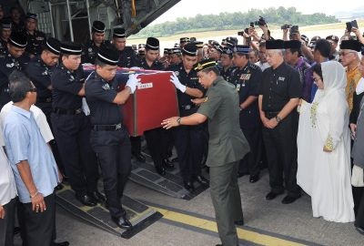 Najib dan isteri, Datin Seri Rosmah Mansor (kanan) menyambut Jenazah Sarjan Sabarudin Daud, 46 dan Inspektor Zulkifli Mamat, 29, yang telah selamat tiba di Pangkalan TUDM, Subang pada Sabtu. - FotoBERNAMA