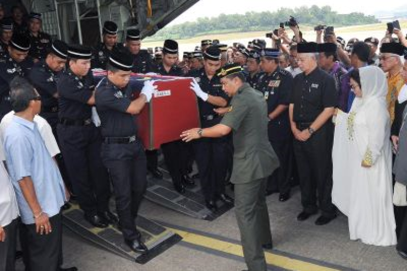 Najib dan isteri, Datin Seri Rosmah Mansor (kanan) menyambut Jenazah Sarjan Sabarudin Daud, 46 dan Inspektor Zulkifli Mamat, 29, yang telah selamat tiba di Pangkalan TUDM, Subang pada Sabtu. - FotoBERNAMASUBANG JAYA: Jenazah anggota polis komando Inspektor Zulkifli Mamat, 29, dan Koperal Sabaruddin Daud, 46, tiba di Pangkalan Tentera Udara Diraja Malaysia (TUDM) Subang di sini pada pukul 12.30 tengah hari, Sabtu.Jenazah kedua-dua Allahyarham diberi penghormatan terakhir semasa ketibaan. Suasana pilu menyelubungi pangkalan TUDM dengan kehadiran ahli keluarga Allahyarham Zulkifli dan Sabaruddin.Bercakap kepada pemberita di situ, Perdana Menteri Datuk Seri Najib Tun Razak berkata kerajaan akan memberi dua pilihan kepada kumpulan bersenjata Sulu iaitu menyerah diri atau terima apa juga akibat daripada tindakan yang telah dilakukan.Najib berkata, beliau telah bercakap dengan Presiden Filipina Benigno Aquino pada malam Jumaat mengenai perkara itu.Katanya, pintu rundingan telah ditutup memandangkan kumpulan bersenjata Sulu mengambil pendekatan untuk menentang tindakan itu."Kumpulan bersenjata Sulu harus menyerah diri atau akan berdepan tindakan daripada pasukan keselamatan kita," katanya kepada pemberita selepas memberi penghormatan terakhir kepada jenazah kedua-dua anggota polis yang terkorban di sini pada Sabtu.