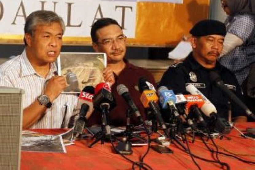 Ahmad Zahid (kiri) menunjukkan gambar mayat penceroboh Sulu yang ditemui oleh pasukan keselamatan Malaysia dalam satu operasi, pada sidang media di Lahad Datu, Rabu. Turut serta Menteri Dalam Negeri, Datuk Seri Hishammuddin Tun Hussein (tengah). Foto NORMIMIE DIUN / THE STAR