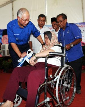 Perdana Menteri, Datuk Seri Najib Tun Razak (dua, kiri) menyampaikan sumbangan kerusi roda kepada, Zauwiah Ibrahim, 54, yang mengidap penyakit angin ahmar pada Majlis Pemimpin Bersama Rakyat di Kampung Mengabang Telipot di Kuala Terengganu pada Rabu. -Foto BERNAMA