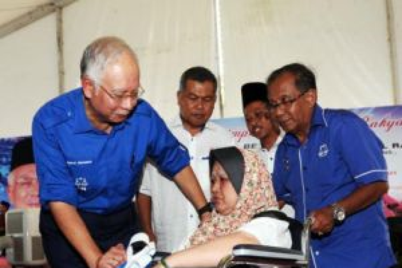 Perdana Menteri, Datuk Seri Najib Tun Razak (dua, kiri) menyampaikan sumbangan kerusi roda kepada, Zauwiah Ibrahim, 54, yang mengidap penyakit angin ahmar pada Majlis Pemimpin Bersama Rakyat di Kampung Mengabang Telipot di Kuala Terengganu pada Rabu. -Foto BERNAMAKUALA TERENGGANU: Datuk Seri Najib Tun Razak menegaskan Umno bukan parti assabiyah seperti yang didakwa Pakatan Rakyat, walaupun ia berpegang kepada dasar perjuangan kebangsaan.Perdana Menteri berkata kerajaan tidak pernah menolak Islam dalam pentadbiran negara, malah semangat kebangsaan Umno adalah berteraskan Islam. "Kebangsaan kita bukan assabiyah. Makna assabiyah itu ialah bila kita berpakat melakukan kerja-kerja yang batil, maknanya berpakat antara satu puak untuk menindas atau menzalimi puak lain, itu assabiyah," katanya ketika berucap di hadapan kira-kira 6,000 hadirin pada Majlis Pemimpin Bersama Rakyat di Mengabang Telipot di sini, Rabu.Turut hadir isteri beliau Datin Seri Rosmah Mansor, Menteri Besar Terengganu Datuk Seri Ahmad Said yang juga calon Dewan Undangan Negeri (DUN) Kijal dan beberapa calon Barisan Nasional (BN) negeri itu bagi pilihan raya umum ke-13.Najib, yang juga Presiden Umno, sebelum itu mempersoal kenyataan Mursyidul Am PAS Datuk Nik Abdul Aziz Nik Mat bahawa sembahyang orang Umno tidak mendapat pahala kerana menolak Islam dan berjuang atas semangat kebangsaan."Saya nak tanya Nik Aziz, pahala dosa itu kuasa Mursyidul Am atau kuasa Allah? "Saya percaya ini bukan bidang kuasa manusia, bukan kuasa Mursyidul Am, malah Nabi, Rasul pun tak berani...ini kuasa Allah, itupun dia nak ambil...ini semua kerana politik," katanya.Nik Aziz baru-baru ini menggunakan statusnya untuk mengeluarkan fatwa bahawa perjuangan Umno bersandarkan assabiyah atau perkauman.Menteri Besar Kelantan itu mendakwa kerana menganut fahaman ini, maka Umno telah menolak Allah.Menjelas lanjut isu itu, Najib berkata perjuangan kebangsaan Umno telah membebaskan Malaysia daripada dijajah dan dizalimi oleh British.Umno hari ini berjuang atas dasar "maqasid syariah", dan ia diakui ulama antarabangsa sebagai antara negara terbaik daripada aspek pematuhan konsep tersebut, katanya. "Apabila dikatakan kita patuh pada maqasid syariah, maknanya kita mempertahankan agama, mempertahankan kalimah Allah."Jadi siapa yang cakap berdolak dalih sekarang...ini semua pasal politik, nak cari undi," tempelak Najib.Beliau menegaskan soal prinsip, agama dan kalimah Allah tidak boleh dipermainkan oleh sesiapa.Walaupun suaranya semakin serak kerana terlalu banyak bercakap, Perdana Menteri tetap bersemangat meneruskan kempen bagi BN menjelang hari pengundian Ahad ini."Walaupun suara saya macam ni, tapi tak apalah, janji BN menang," katanya yang disambut tepukan gemuruh daripada hadirin.Program itu mengakhiri lawatan Najib di Terengganu sebelum kembali ke Kuala Lumpur untuk menghadiri Perhimpunan Perdana 50,000 warga Universiti Teknologi MARA (UiTM) dan pelancaran Yayasan Destini Anak Bangsa Bersama Perdana Menteri malam ini. -BERNAMA