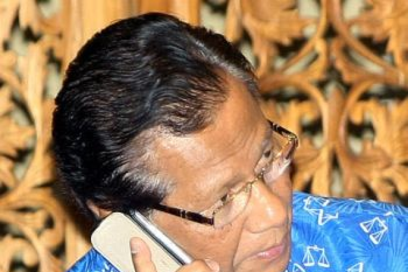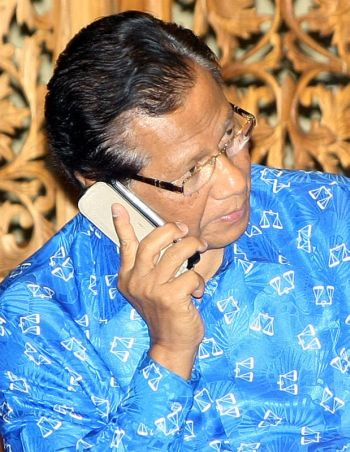 Calon Barisan Nasional (BN) Parlimen Gelang Patah Datuk Abdul Ghani Othman berbual menerusi telefon setelah mengetahui keputusan rasmi penjumlahan undi bagi kerusi Parlimen Gelang Patah di Persada Johor di sini, awal pagi Isnin. Abdul Ghani tewas kepada calon DAP, Lim Kit Siang. -Foto BERNAMA