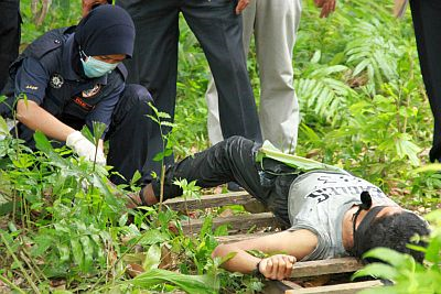 Mayat lelaki berusia lingkungan 20-an itu yang bahagian matanya turut ditutup dengan ikatan kain ditemui kira-kira pukul 10 pagi oleh orang ramai yang kemudiannya melaporkan kepada polis.