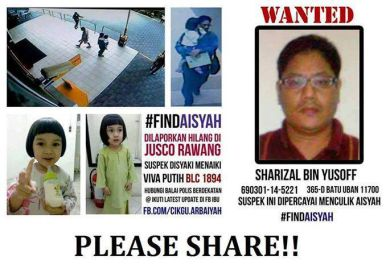 Berita mengenai kehilangan Aisyah turut disebarkan menerusi Facebook untuk menarik perhatian orang ramai.PETALING JAYA: Di saat bahang sambutan Aidilfitri semakin terasa, seorang ibu memohon bantuan rakyat Malaysia dalam usaha mengesan anak perempuannya berusia tiga tahun, Aisyah Wan Exzan yang dilaporkan hilang di Rawang pada Selasa.Ketua Polis Daerah Gombak, Asisten Komisioner Abdul Rahim Abdullah berkata ibu Aisyah, Arbaiyah Md Zin didakwa bertemu dengan penculik tersebut menerusi laman sosial Facebook pada Mei dan menjalin hubungan dengan suspek serta merancang untuk berkahwin. Walupun hanya mengenali lelaki tersebut selama beberapa minggu, Arbaiyah, seorang guru matematik berusia lewat 30-an, meninggalkan anak perempuannya itu dibawah jagaan suspek pada 30 Julai.Suspek memberitahu Arbaiyah bahawa dia ingin memperkenalkan Aisyah kepada kakaknya.Ibu kanak-kanak itu turut memberikan suspek sijil kelahiran Aisyah kerana mereka berdua merancang untuk pergi berbulan madu bersama kanak-kanak tersebut selepas mereka berkahwin."Pada 2 Ogos, Arbaiyah turut memberi wang tunai RM25,000 kepada lelaki tersebut untuk pelaburan perniagaan emas di sebuah pusat membeli-belah di Rawang."Keesokan harinya, Arbaiyah menunggu suspek untuk membawa Aisyah pulang ke rumah. Suspek berjanji untuk membawanya keluar dan membeli barang keperluan perkahwinan mereka. Namun suspek tidak muncul dan panggilan ke telefon bimbitnya tidak berjawab," kata Abdul Rahim kepada The Star.Beliau berkata ibu mangsa turut pergi ke rumah suspek di Taman Tun Dr Ismail dalam usaha mencari anak perempuannya itu tetapi alamat rumah tersebut milik orang lain.Kes itu diklasifikasikan polis sebagai penculikan kanak-kanak.Abdul Rahim berkata siasatan masih dijalankan dan menggesa orang ramai untuk tidak membuat sebarang spekulasi mengenai perkara itu sehingga maklumat lanjut diketahui.Sementara itu, #findaisyah tersebar pantas di laman Twitter dengan pengguna Internet seluruh negara menggunakan medium tersebut untuk mencari kanak-kanak tersebut selepas berita penculikannya disebarkan dalam laman media sosial awal pagi Isnin.