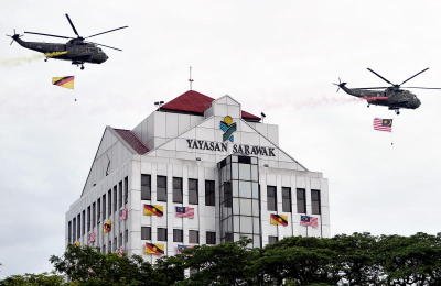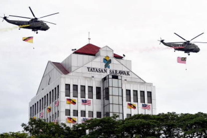 Dua buah pesawat Nuri milik Tentera Udara Diraja Malaysia (TUDM) melintasi bangunan Yayasan Sarawak pada Istiadat Perbarisan dan Rapat Raksasa Sambutan Jubli Emas 50 Tahun Sarawak Merdeka Dalam Malaysia di Padang Merdeka di Kuching, Isnin. -fotoBERNAMAKUCHING: Sarawak sedang merangka pendekatan untuk menjadi negeri maju berpendapatan tinggi menjelang 2030, kata Ketua Menteri Tan Sri Abdul Taib Mahmud, Isnin.Menyifatkan cita-cita ini sebagai Sarawak Gemilang 2030, beliau berkata Sarawak yang ketinggalan agak jauh dari segi pembangunan sewaktu peringkat awal penubuhan Malaysia kini sudah dapat menyaingi negeri lain yang maju lebih dahulu daripadanya. "Hala tuju kita semakin mendekati Wawasan 2020 tapi di Sarawak kita tidak akan berhenti di situ sahaja kerana impian emas kita untuk mencapai Sarawak Gemilang menjelang 2030," katanya semasa berucap dalam Istiadat Perbarisan dan Rapat Raksasa Sambutan Hari Malaysia Ke-50 di Padang Merdeka di sini.Yang di-Pertuan Agong Tuanku Abdul Halim Mu'adzam Shah berkenan untuk berangkat menyempurnakan istiadat itu yang turut dihadiri Raja Permaisuri Agong Tuanku Hajah Haminah.Perdana Menteri Datuk Seri Najib Tun Razak dan Timbalan Perdana Menteri Tan Sri Muhyiddin Yassin adalah antara kenamaan yang menghadiri istiadat berkenaan.Taib berkata pencapaian Sarawak selepas 50 tahun merdeka melalui penubuhan Malaysia adalah hasil kerjasama rapat antara kerajaan persekutuan dan kerajaan negeri."Kami merasakan semakin teguh dalam Malaysia dan kami mahu menyumbang lebih lagi," katanya.Taib berkata pengwujudan Koridor Tenaga Boleh Diperbaharui Sarawak (SCORE) adalah antara pendekatan kerajaan dalam usaha untuk mencapai status negeri berpendapatan tinggi yang sekali gus membuka lebih banyak peluang pekerjaan dan meningkatkan taraf hidup rakyatnya.Katanya pembangunan Taman Perindustrian Samalaju di Bintulu yang menjadi sebahagian daripada SCORE sehingga kini berjaya menarik pelaburan lebih RM24 bilion oleh 15 buah syarikat multinasional."Ini adalah antara contoh pembangunan yang dilaksanakan untuk merealisasikan harapan Sarawak untuk menjadi negeri berpendapatan tinggi," katanya.Beliau berkata hubungan erat antara Sarawak dan Kerajaan Pusat yang diterajui Najib akan diperkukuhkan lagi bagi memastikan pembangunan yang berlaku di negeri ini akan berlangsung secara menyeluruh dan memberikan manfaat maksimum kepada rakyat."Hasrat dan komitmen kerajaan Barisan Nasional negeri adalah untuk melaksanakan program yang memberi impak besar kepada rakyat," katanya. - BERNAMA