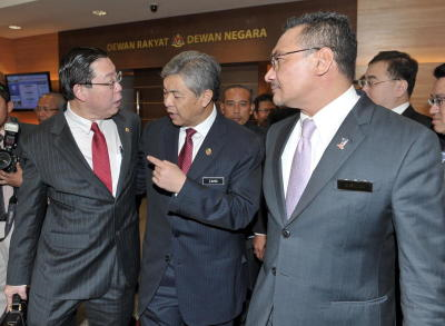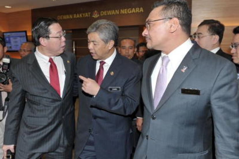 Menteri Dalam Negeri, Datuk Seri Dr Ahmad Zahid Hamidi (tengah) beramah mesra dengan Anggota Parlimen Bagan, Lim Guan Eng (kiri) selepas sesi soal jawab di Dewan Rakyat di Bangunan Parlimen, Kuala Lumpur, Isnin. Turut kelihatan Menteri Pertahanan, Datuk Seri Hishammuddin Tun Hussein (kanan). -fotoBERNAMA