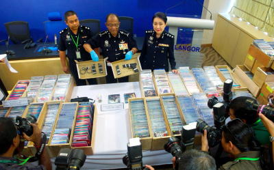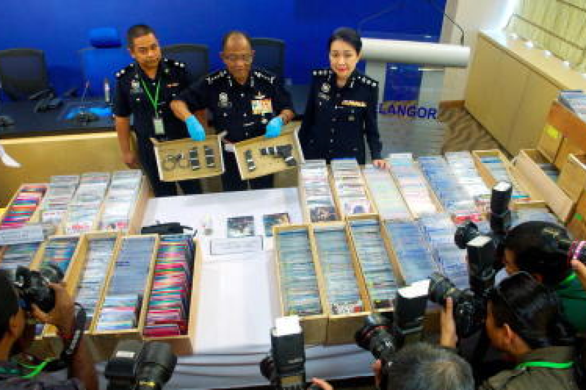 Polis menahan tiga suspek dan merampas 8,179 keping cakera video digital (DVD) tanpa sijil Perakuan B (cetak rompak) bernilai RM60,000 di sebuah unit kondominium mewah Tropicana City Tropics di Petaling Jaya Jumaat lepas. Selain DVD, polis juga menemui sepasang gari, lampu suluh, pistol, peluru plastik dan sebilah pisau di unit kondominium terbabit. Ketua Polis Selangor Datuk Mohd Shukri Dahlan (tengah) menunjukkan barang-barang rampasan berkenaan pada sidang media di Ibu Pejabat Polis Kontinjen Selangor di Shah Alam, Isnin. - fotoBERNAMASHAH ALAM: Jabatan Siasatan Jenayah Komersial Selangor menahan tiga suspek dan merampas 8,179 keping DVD haram bernilai RM60,000 di sebuah kondominium mewah di Petaling Jaya Jumaat lepas.Ketua Polis Selangor Datuk Mohd Shukri Dahlan berkata suspek berkenaan ialah seorang lelaki warga Myanmar berusia 30 tahun yang tidak memiliki dokumen perjalanan sah dan dua penduduk tempatan dipercayai penjual serta pembungkus DVD haram untuk sebuah sindiket. Beliau berkata polis turut menemui sepasang gari, lampu suluh, dua kelopak peluru pistol, sarung pistol, peluru plastik, peluru bebola besi dan sebilah pisau 'Luminox' di kondominium berkenaan.Siasatan awal terhadap suspek lelaki warga tempatan itu membawa polis ke sebuah premis di Amcorp Mall, Petaling Jaya pada hari sama dan menemui sepucuk pistol tiruan hitam jenama Milspec dan satu kelopak peluru kosong.Mohd Shukri berkata suspek ditahan reman dari Sabtu lepas hingga esok dan kes DVD haram disiasat mengikut Seksyen 6 Akta Penapisan Filem 2002 manakala kes pistol tiruan disiasat mengikut Seksyen 2 Akta Senjata Api 1959.Beliau berkata siasatan juga dijalankan bagi mengetahui operasi sindiket penjualan DVD haram yang disyaki beroperasi sejak tahun lepas bagi pasaran di negeri ini. - BERNAMA