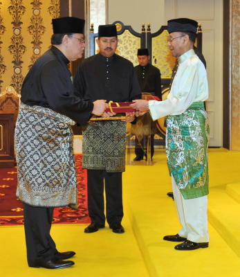 Yang di-Pertuan Agong, Tuanku Abdul Halim Mu'adzam Shah berkenan pengurnian watikah perlantikan Duta Malaysia ke Indonesia, Datuk Seri Zahrain Mohamed di Istiadat perlantikan Duta Malaysia ke Negara Asing di Istana Negara, Kuala Lumpur, Rabu. -fotoBERNAMA