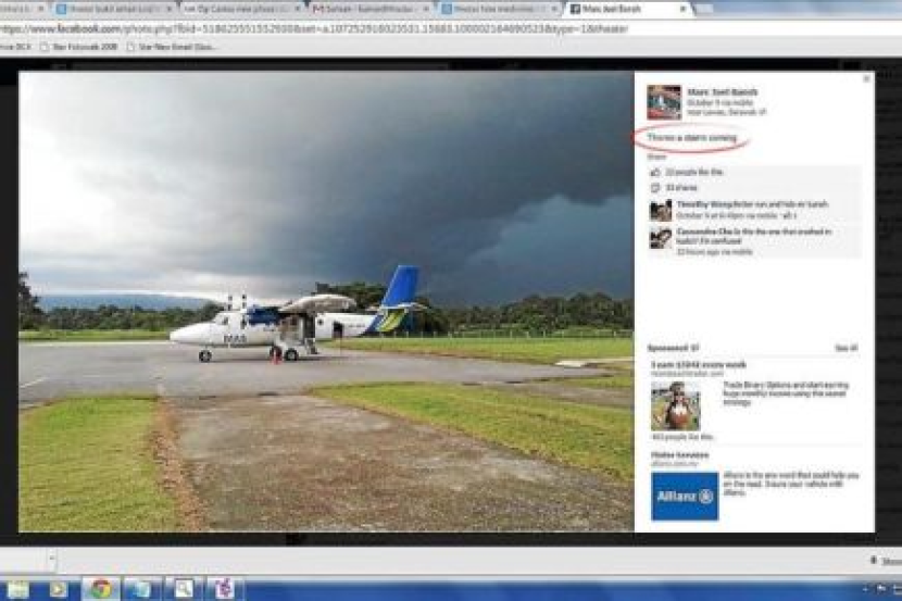 KOTA KINABALU: Sehari sebelum kejadian insiden malang pesawat MASWings terhempas di Kudat pada Khamis, pembantu juruterbang Marc Joel Bansh memuat naik sekeping gambar pesawat Twin Otter dengan latar belakang awan gelap dan langit mendung berserta dengan kapsyen: "Ribut petir akan melanda."