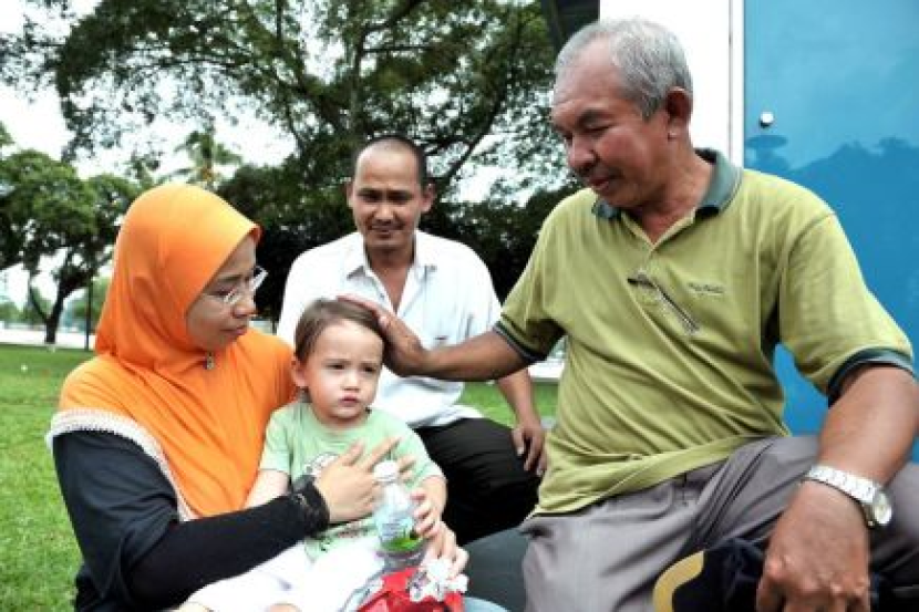 Bayi mangsa culik, Freddie Joseph ketika pertama kali ditemui orang awam, seorang pemandu lori, Hamid Md Isa (kanan) di Taman Tasik Titiwangsa di Kuala Lumpur Sabtu lalu.