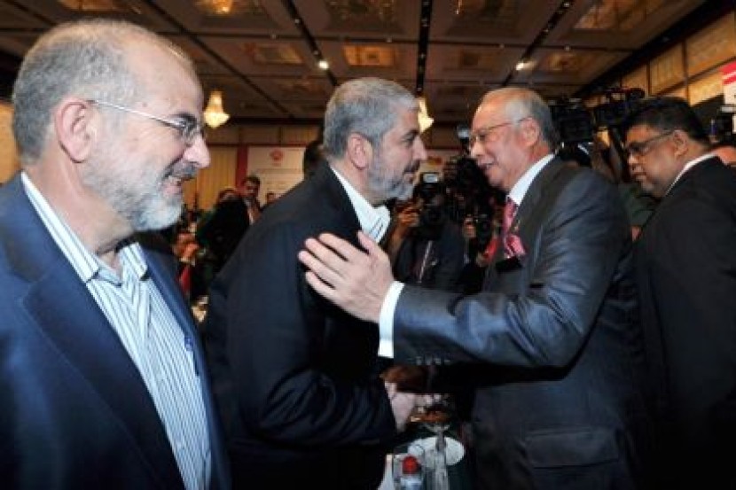 Perdana Menteri, Datuk Seri Najib Tun Razak (dua, kanan) bersalaman bersama Presiden Hamas, Khaled Meshaal (dua, kiri) di Forum Antarabangsa Umno 2013 sempena Perhimpunan Agung Umno 2013 di Pusat Dagangan Dunia Putra (PWTC) di Kuala Lumpur pada Isnin. - foto BERNAMA