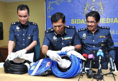 Chik Omar (tengah) menunjukkan rampasan dadah jenis methaphetamine yang disorok di dalam kasut pada sidang media di Sepang, Khamis. - fotoBERNAMASEPANG: Dua wanita warga China ditahan secara berasingan di Terminal Penerbangan Tambang Murah (LCCT) di sini pada Isnin dan Selasa lepas dan dadah methamphetamine seberat 9.1kg bernilai RM1.6 juta dirampas daripada mereka.Pengarah Kastam Lapangan Terbang Antarabangsa Kuala Lumpur (KLIA) Datuk Chik Omar Chik Lim berkata dalam kes pertama, wanita China berumur 19 tahun ditahan pada 2.50 pagi Isnin selepas dia didapati menyembunyikan 6.1kg methamphetamine bernilai RM1.1 juta dalam 14 pasang pelapik kasut but di dalam bagasinya. Rampasan kedua pada Selasa membabitkan seorang lagi wanita China berumur 29 tahun pada 1.30 pagi setelah didapati menyimpan 3kg methamphetamine bernilai RM570,000 di dalam dua gulungan wayar di dalam bagasinya, katanya dalam sidang media di sini Khamis.Katanya siasatan mendapati modus operandi sindiket dadah dari China kini menggunakan wanita muda dan cantik untuk menyeludup dadah.Kes disiasat mengikut Seksyen 39B Akta Dadah Berbahaya 1952 yang membawa hukuman mati mandatori jika disabitkan kesalahan, katanya.Sementara itu, Chik Omar berkata sepanjang tahun lepas Jabatan Kastam Diraja Malaysia telah mematahkan 67 percubaan penyeludupan dadah menerusi LCCT dan KLIA yang melibatkan 55 tangkapan dan membabitkan rampasan 809.9kg dadah bernilai RM47.6 juta Jumlah itu meningkat berbanding tahun 2012 yang membabitkan 61 kes dan 68 tangkapan dengan rampasan 317.3kg dadah bernilai RM36.2 juta, katanya. - BERNAMA