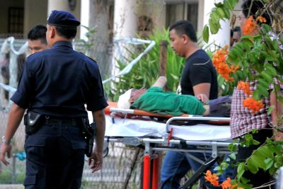 Seorang lelaki mengelar hingga mati anak perempuannya yang berusia tujuh tahun dan mencederakan dua lagi anak perempuannya di rumah mereka di Seksyen 4 Bandar Baru Bangi di Bangi, petang Khamis. Kelihatan anggota polis menahan suspek yang juga bapa kepada mangsa terbabit untuk siasatan lanjut. Foto MUHAMAD SHAHRIL ROSLI / THE STAR
