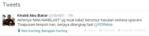 "Akhirnya ‘MAN NANBLAST’ yang muat kata-kata berunsur hasutan semasa upacara Thaipusam tempoh hari berjaya ditangkap tadi @PDRMsia," tulis beliau di Twitter.