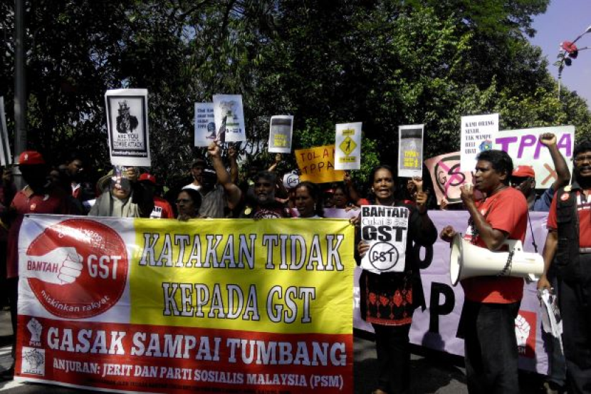 KUALA LUMPUR: Satu kumpulan yang diketuai oleh Parti Sosialis Malaysia (PSM) mengadakan protes di hadapan Parlimen pada Rabu, membantah pelaksanaan TPPA dan GST. Kumpulan itu mendakwa pelaksanaan Perjanjian Perkongsian Trans-Pasifik (TPPA) dan Cukai Barangan dan Perkhidmatan (GST) akan menaikkan harga keperluan asas seperti ubat-ubatan dan makanan. Ahli Parlimen Sungai Siput Dr Michael Jayakumar berkata ahli-ahli parlimen dan juga rakyat tidak mengetahui apa-apa mengenai pelaksanaan itu. "Kita tidak tahu kandungan perjanjian itu. Apa yang boleh kita lakukan ialah melihat perjanjian antara AS dan negara-negara lain sebelumnya dan bertanya kepada kerajaan jika itu juga yang telah dipersetujui mereka. "Kami mahu mereka memberi kita masa yang cukup untuk melihatnya. Ia adalah dokumen 27 bab dan jika mereka akan membentangkannya pada minggu ini dan mengadakan undian pada minggu selepasnya, ia tidak akan berjaya," katanya. Dalam satu kenyataan media oleh jurucakap PSM, A. Sivarajan berkata pelaksanaan GST akan memberi kesan negatif terhadap golongan berpendapatan rendah. "Enam peratus GST hanya permulaan. Ia akan meningkat dan golongan berpendapatan rendah akan terjejas. "Dalam tempoh 10 tahun kebelakangan ini, harga barangan dan perkhidmatan meningkat tetapi gaji bagi kumpulan ini tidak meningkat. GST hanya akan memburukkan lagi keadaan," katanya. Kumpulan pemprotes turut menyerahkan dua memo mengenai isu itu kepada Dr Jayakumar, yang akan diserahkan kepada pemimpin Barisan Nasional dan Pakatan Rakyat.
