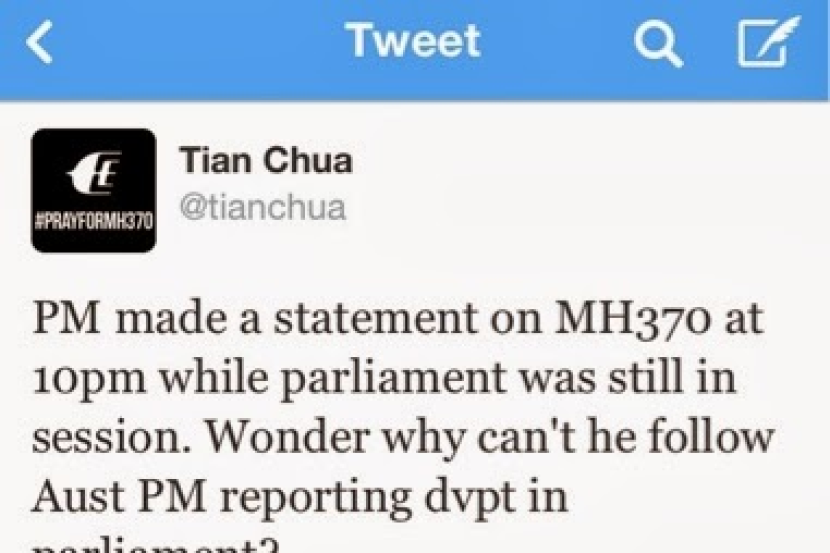 Tian Chua dalam tweeternya telah mengeluarkan kenyataan, "PM made a statement on MH370 at 10pm while parliament was still in sission. Wonder why can't he follow Aust PM reporting dvpt in parliament". (PM buat kenyataan tentang MH370 pada pukul 10pm sedangkan parlimen sedang bersidang. Mengapa dia tidak ikut PM Australia yang membuat laporan di parlimen".