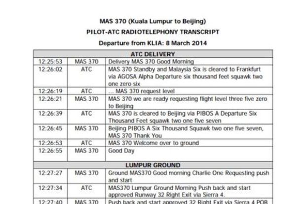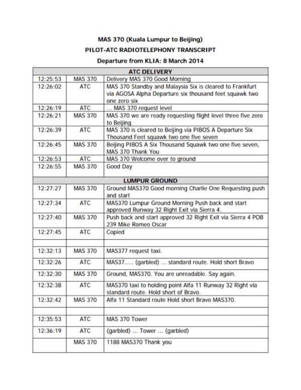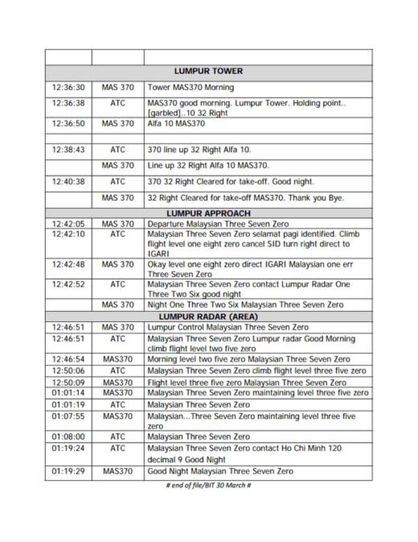 Transkrip itu diakhiri dengan komunikasi trafik udara Malaysia yang terlebih dahulu mengucapkan selamat malam kepada MH370 dan mengarahkan juruterbang untuk menghubungi menara kawalan udara di vietnam sebelum memasuki ruang udara negara itu.