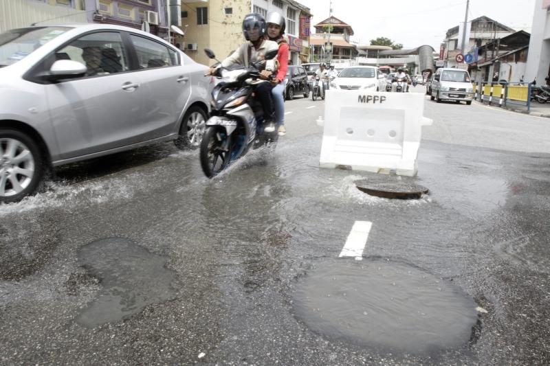 Jalan raya berlopak yang dipenuhi air membahayakan kenderaan yang lalu-lalang di Jalan Burma.