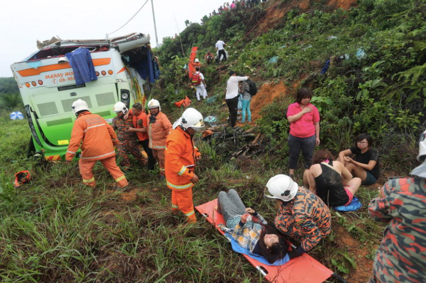 KUANTAN: Seorang pelancong Singapura terpaksa bertarung nyawa untuk menyelamatkan diri dengan keluar menerusi cermin tingkap bas yang pecah apabila bas persiaran yang dinaikinya terjunam ke dalam gaung di KM 70, Jalan Kuantan-Segamat, di sini, petang Ahad. Mengimbas kembali detik cemas tersebut, Karthiksan, 27, berkata ketika kejadian pemandu bas berkenaan memandu dengan perlahan dan keadaan jalan raya adalah baik. "Secara tiba-tiba bas hilang kawalan sebelum terjatuh ke dalam gaung sedalam 10 meter dan menyebabkan bas berpusing beberapa kali. "Saya terkejut dan ingatkan sudah mati, kami terus keluar daripada cermin bas yang sudah pecah untuk menyelamatkan diri," kata warga India itu yang bekerja di sebuah syarikat perisian komputer di republik itu. Rakannya, S Balaji, 29, berkata beliau tersedar daripada tidurnya apabila bas itu mula hilang kawalan sebelum terjunam ke dalam gaung. "Ada di antara penumpang lain menjerit ketakutan, kami terus keluar daripada cermin tingkap yang pecah untuk menyelamatkan diri," katanya. Dalam nahas yang berlaku kira-kira 4.30 petang itu, seorang pelancong lelaki berusia 30-an warga Singapura maut, manakala 39 orang lagi termasuk dua orang pemandu mengalami kecederaan. Bas berkenaan yang dipercayai dipandu oleh pemandu warga tempatan dalam perjalanan dari Kuala Terengganu menuju ke Singapura.