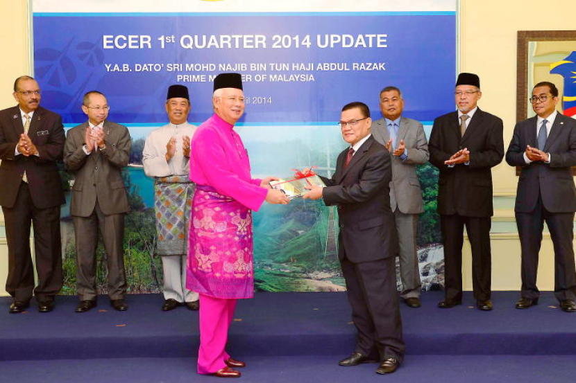 Najib yang juga merupakan Pengerusi ECERDC menyampaikan dokumen berkenaan kepada Menteri Besar Pahang, Datuk Seri Adnan Yaakob, Menteri Besar Terengganu, Datuk Seri Ahmad Said, Menteri Besar Kelantan, Datuk Ahmad Yakob dan Menteri Besar Johor, Datuk Seri Mohamed Khaled Nordin pada majlis pengumuman Laporan Suku Pertama 2014 ECER di Bangunan Perdana Putra di sini, Jumaat.
