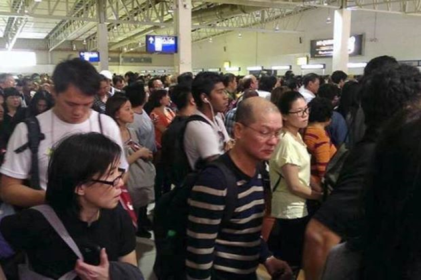 Para penumpang yang tiba di LCCT, Sepang terpaksa beratur panjang dalam keadaan sesak dan tidak selesa sebelum mereka dapat melalui pemeriksaan imigresen.