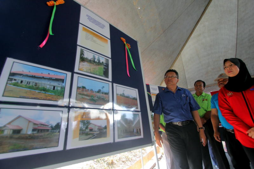 Abdul Rahman (kiri) melihat pameran kerja menaiktaraf taman selepas merasmikan Majlis Penyerahan Projek Strategi Lautan Biru Kebangsaan (NBOS) Kejiranan Indah Taman Jengka Impian di sini, Sabtu.